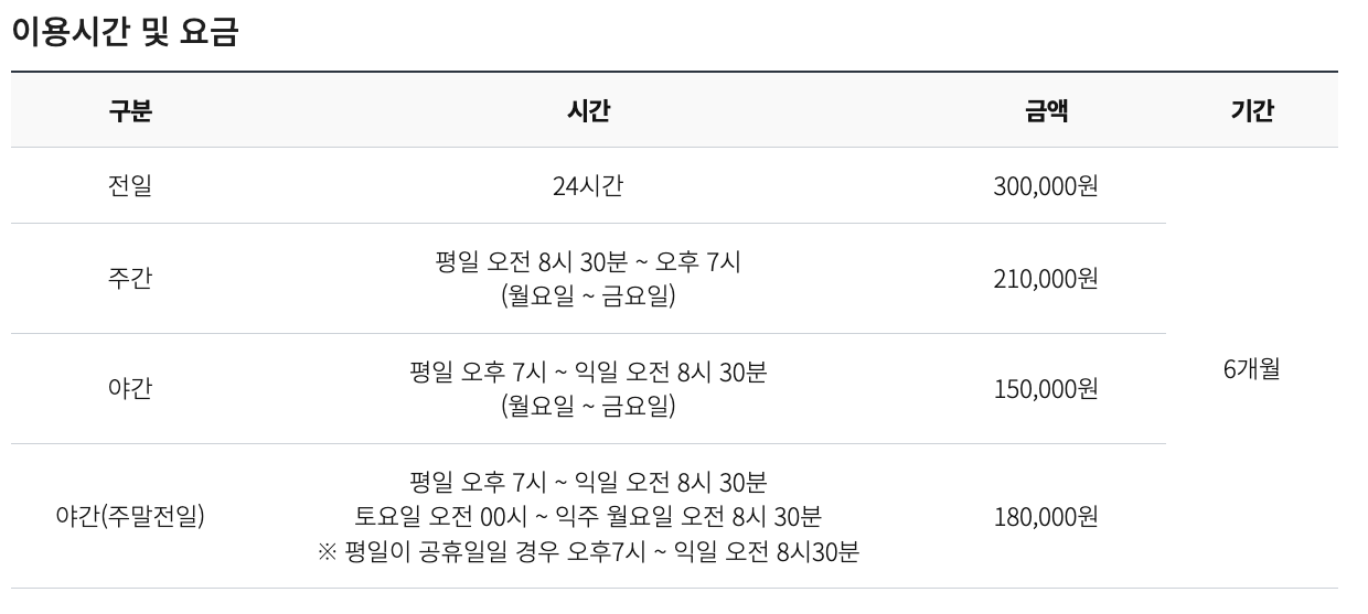 - 주간(평일 08:30~19:00): 210,000원 / 6개월