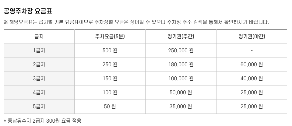 - 1급지: 5분 500원 / 정기권(주간) 250,000원