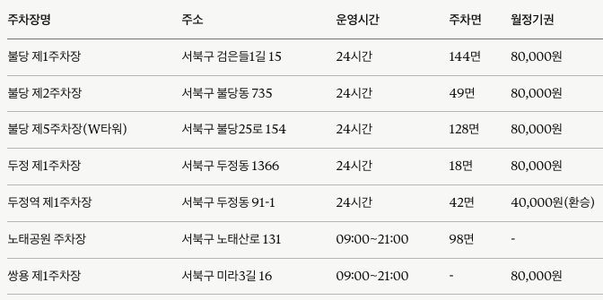두정역 제1주차장(두정동 91-1·환승)이 월 40,000원으로 가장 저렴합니다.